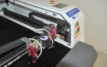 LASER RC-AF1610-150D, s pracovní plochou 1400 × 1000 mm s možností posuvu pracovního stolu v ose Z. Zdvojená hlava umožňuje zrychlení práce při řezání menších výřezů. Na obou těchto laserových zařízeních jsme schopni zpracovat většinu nekovových materiálů.